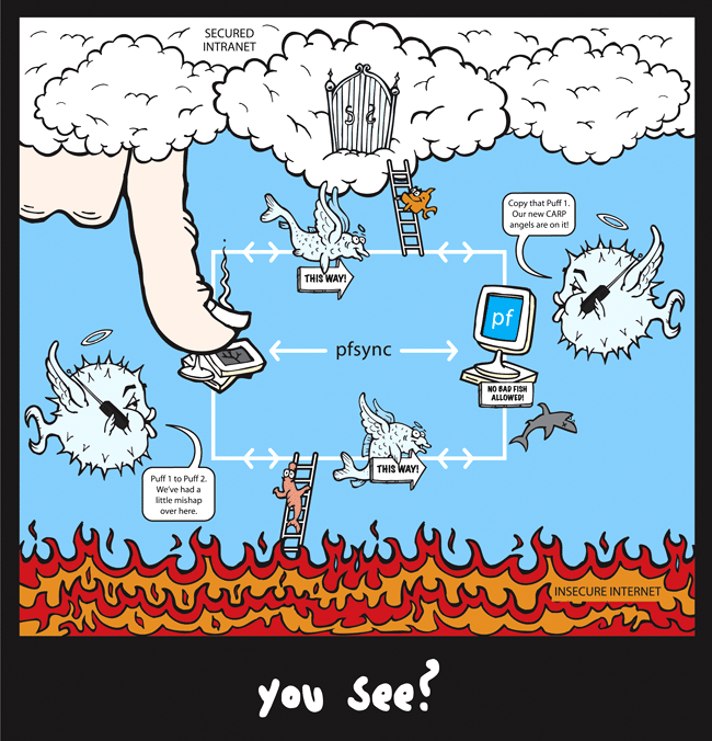 A redundant firewall setup, showing how Puffy and CARP coordinate firewall failover. "Redundancy must be free... you see?"