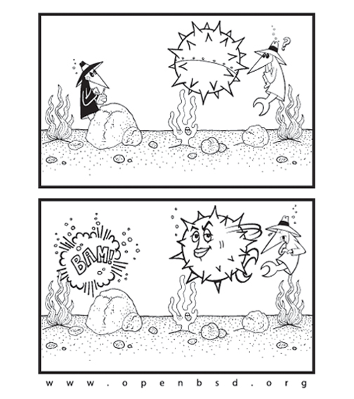Front of T-shirt contains a picture of the Blowfish, and a vague reference to how using the blowfish cipher for the OpenBSD password hash makes our password mechanism more secure (blowfish, not babblefish). People won't be able to crack your passwords anymore... Back of T-shirt contains the complete source code for our version of the Blowfish algorithm (written in Germany). For more information see our cryptography page...